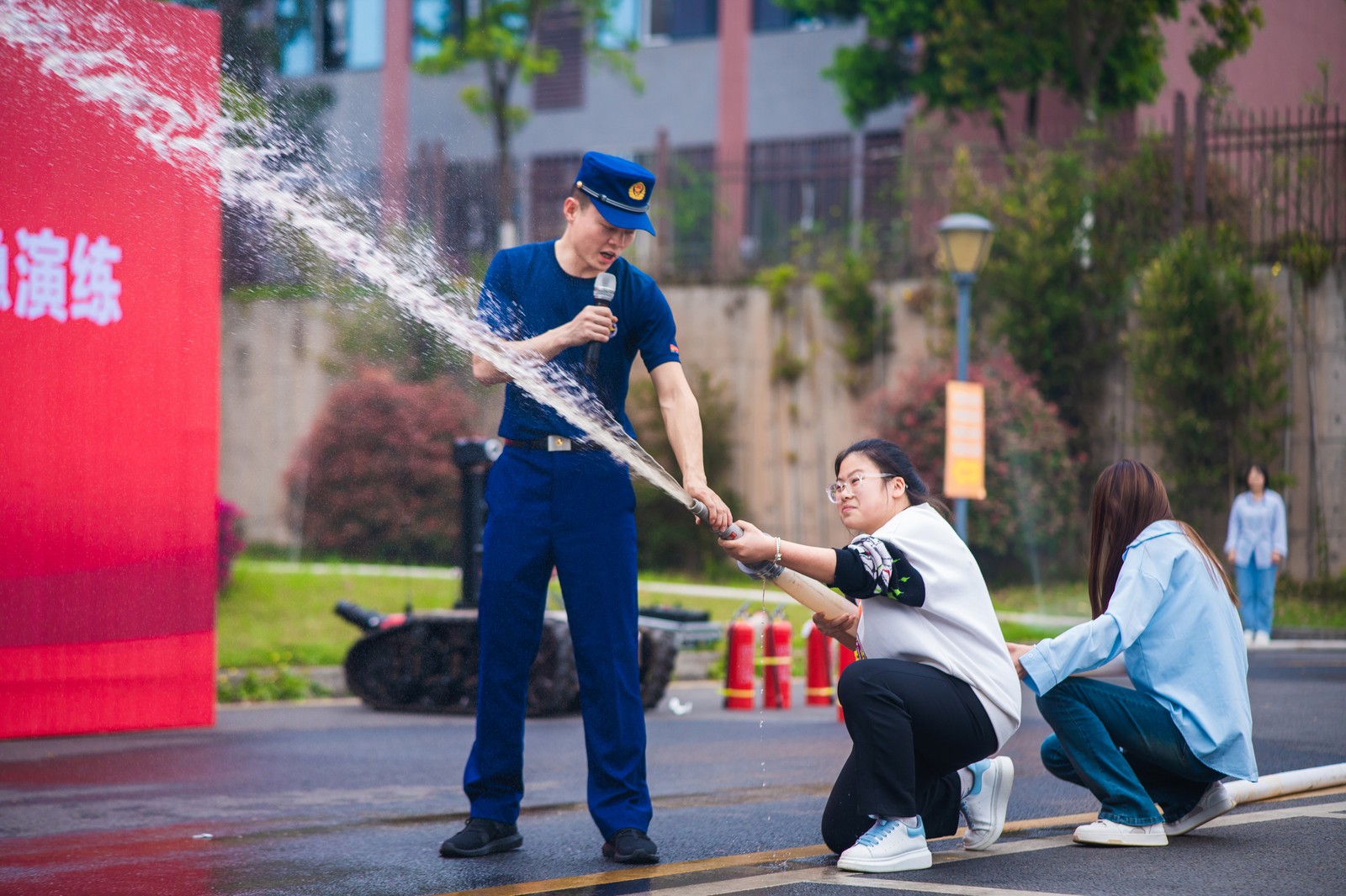 演練結束后,納溪消防大隊教官就使用滅火器撲滅初期火災和火勢擴大后如何連接消防水帶進行滅火進行了培訓講解,并指導教職工和學生進行實操練習。通過“零距離”教學,提升了參演人員應急處置能力和自防自救能力。此外,消防隊還向大家展示了“飛龍”智能機器人的強大滅火功能,為大家?guī)砹艘粓鲆曈X盛宴。