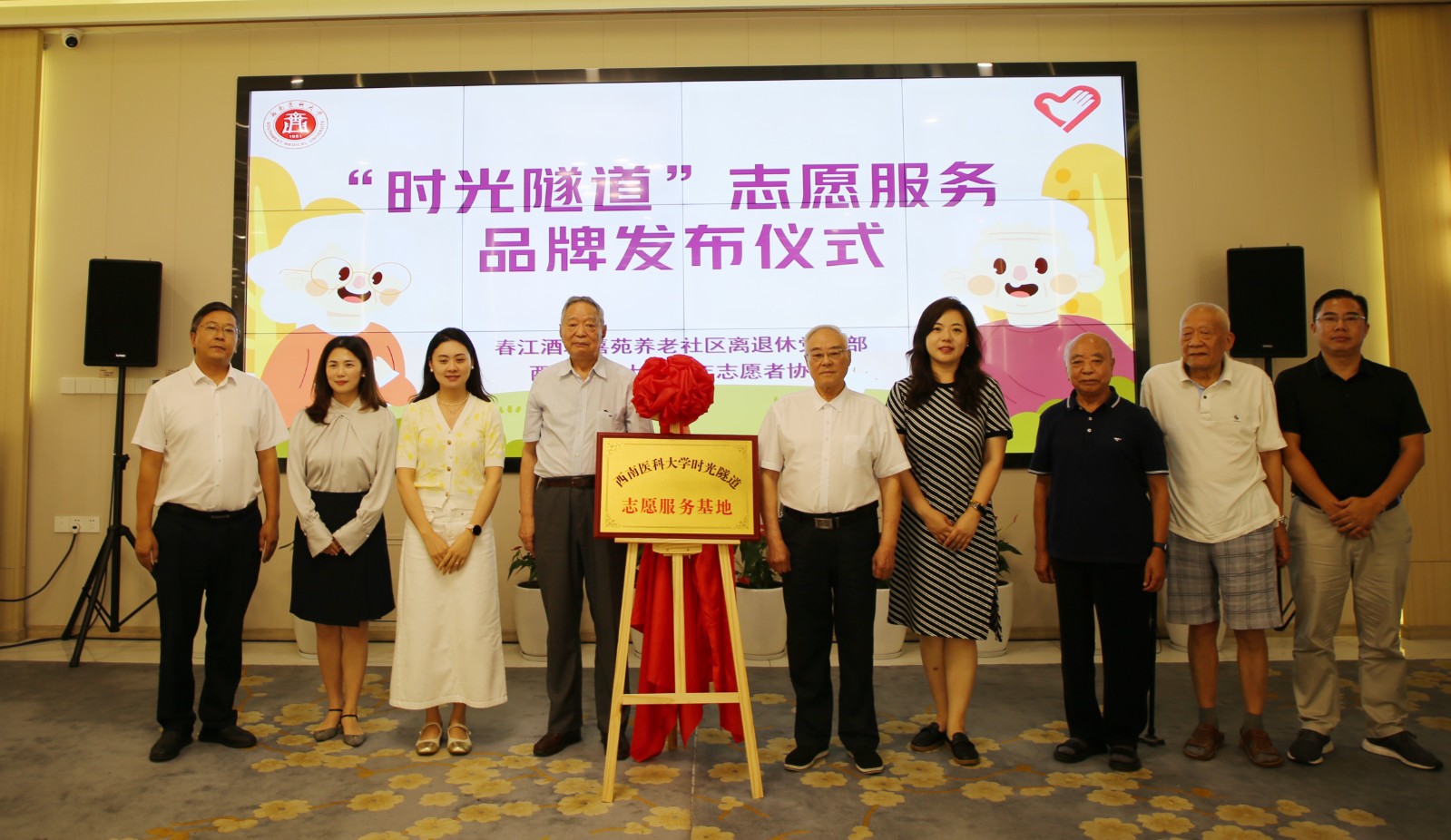 在“時(shí)光隧道”志愿服務(wù)品牌發(fā)布儀式上,春江酒城嘉苑離退休黨支部副書(shū)記、西南醫(yī)科大學(xué)附屬醫(yī)院黨委副書(shū)記、護(hù)理學(xué)院黨委書(shū)記張?zhí)戾a致歡迎辭,劉星伶副部長(zhǎng)和游瑞林書(shū)記為“時(shí)光隧道”項(xiàng)目社會(huì)實(shí)踐基地揭牌。