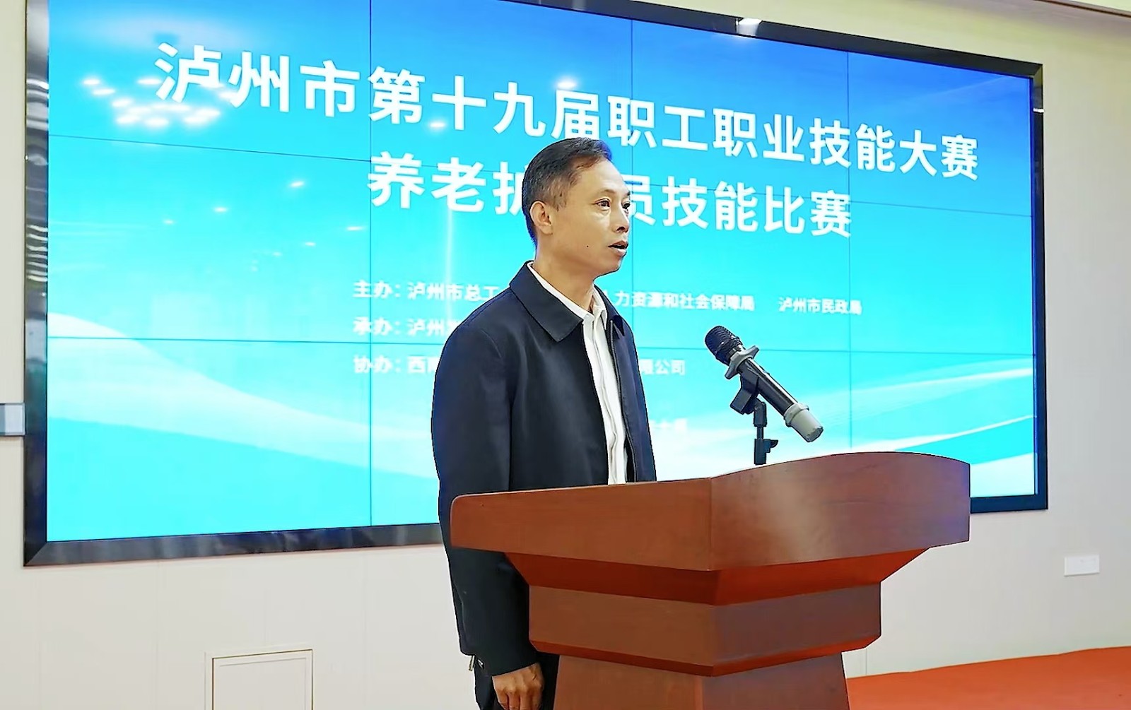 本次比賽由瀘州市總工會(huì)、瀘州市人社局、瀘州市民政局主辦,瀘州發(fā)展控股集團(tuán)承辦,西南醫(yī)投集團(tuán)協(xié)辦,全市共有24名選手參賽。比賽采用理論知識考試和實(shí)踐技能操作相結(jié)合的方式,主要考核參賽人員對人社部頒發(fā)的《養(yǎng)老護(hù)理員國家職業(yè)標(biāo)準(zhǔn)》等理論知識和技能操作要求的掌握程度。