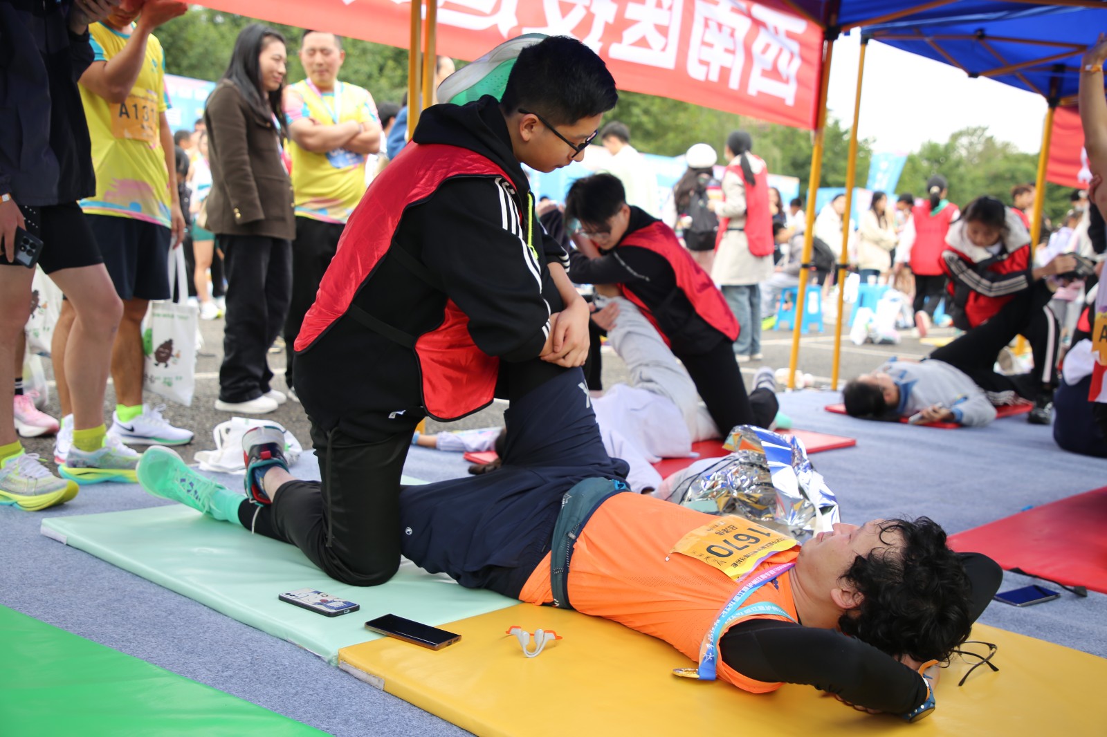 比賽前夕,運(yùn)動健康中心提前布置現(xiàn)場,科學(xué)設(shè)置肌貼區(qū)、自由拉伸區(qū)、運(yùn)動損傷康復(fù)區(qū)三個區(qū)域,時(shí)刻準(zhǔn)備為參賽選手提供貼心服務(wù)。比賽階段,運(yùn)動健康中心全程關(guān)注賽場狀況,第一時(shí)間為有需要的選手提供即時(shí)幫助與服務(wù)。其專業(yè)的指導(dǎo)與賽場服務(wù)得到了參賽選手的一致好評。此次馬拉松賽運(yùn)動健康中心派出專業(yè)運(yùn)動康復(fù)師6名,專業(yè)教練5名,志愿者30余名,提供賽前肌貼、賽后拉伸、疼痛評估及康復(fù)服務(wù)等服務(wù)共計(jì)1500余人次。